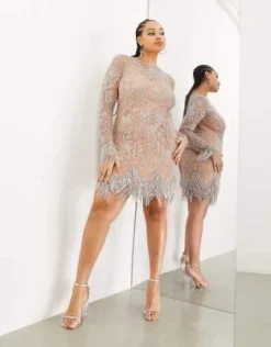 ASOS Edition Curve – Vestito Corto Con Decorazioni E Frange Con Perline Color Cipria