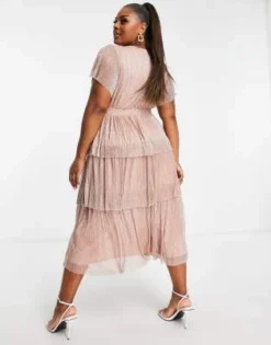 Forever New Curve – Vestito Midi Con Vita A Balze, Ruches E Glitter Oro Rosa
