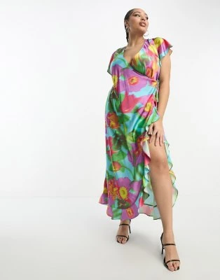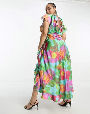 Flounce London Plus – Vestito Lungo Con Maniche Con Volant E Scollo Profondo In Raso Rosa Vivace