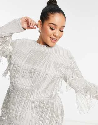 River Island Plus – Vestito Midi Beige Con Volant E Scollo Bardot