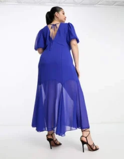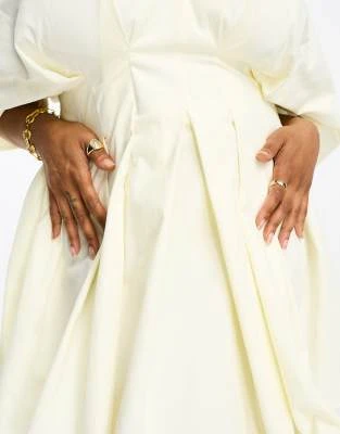 ASOS LUXE Curve – Vestito Midi Decorato Bianco E Blu A Fiori Con Maniche A Sbuffo