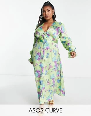 Topshop Curve – Vestito Da Cerimonia Midi In Raso A Fiori Blu