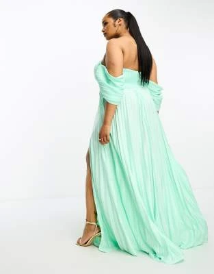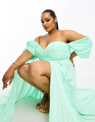 ASOS DESIGN Curve – Vestito Lungo Con Scollo Alla Bardot Plissettato Color Salvia – LGREEN