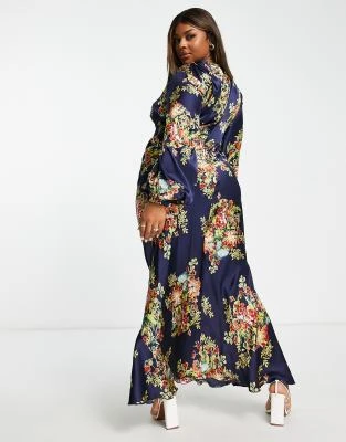 ASOS LUXE Curve – Vestito Midi Decorato Bianco E Blu A Fiori Con Maniche A Sbuffo