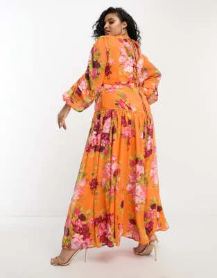 Flounce London Plus – Vestito Lungo Con Maniche Con Volant E Scollo Profondo In Raso Rosa Vivace