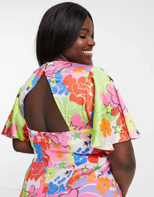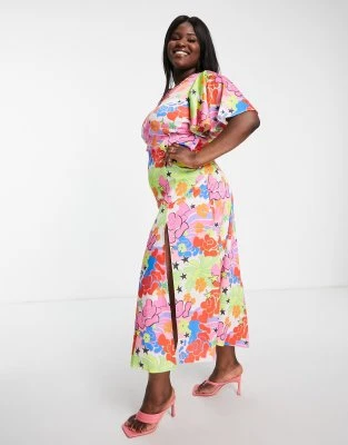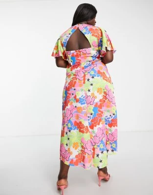 Topshop Curve – Vestito Da Cerimonia Midi In Raso A Fiori Blu