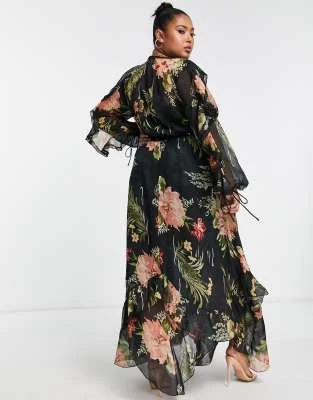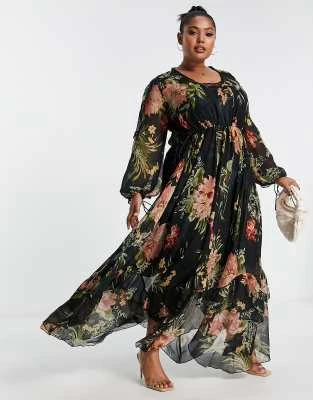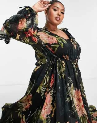 ASOS DESIGN Curve – Vestito Skater Midi Morbido Ricamato Con Godet E Maniche Svasate Nero