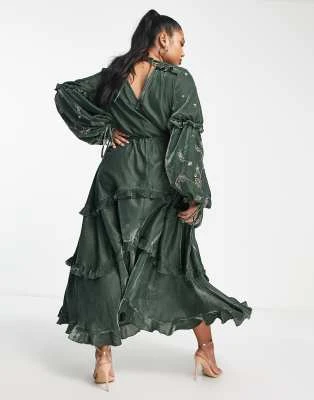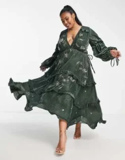 Flounce London Plus – Vestito Lungo Con Spalline Sottili E Volant In Raso Kaki