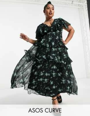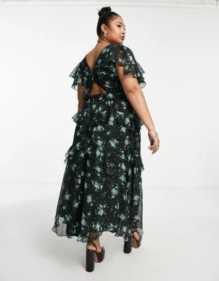 ASOS LUXE Curve – Vestito Midi Decorato Bianco E Blu A Fiori Con Maniche A Sbuffo