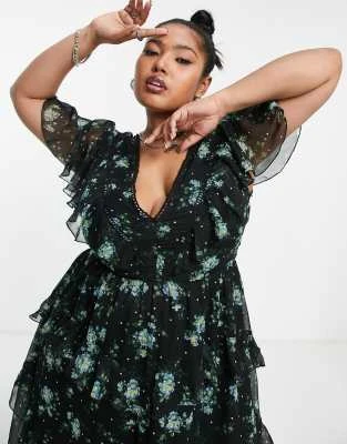 ASOS Edition Curve – Vestito Corto Con Maniche A Campana E Corpetto Ricamato Giallo