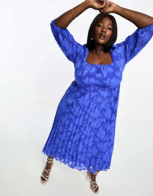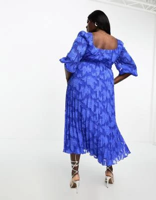 ASOS LUXE Curve – Vestito Midi Decorato Bianco E Blu A Fiori Con Maniche A Sbuffo