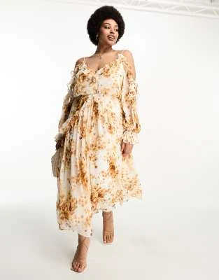 Forever New Curve – Vestito Midi Con Vita A Balze, Ruches E Glitter Oro Rosa