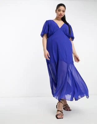 ASOS LUXE Curve – Vestito Midi Decorato Bianco E Blu A Fiori Con Maniche A Sbuffo