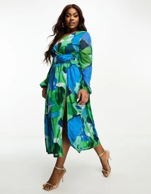 Topshop Curve – Vestito Da Cerimonia Midi In Raso A Fiori Blu