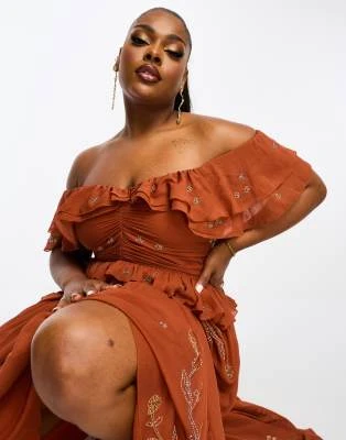 ASOS Edition Curve – Vestito Corto Con Maniche A Campana E Corpetto Ricamato Giallo