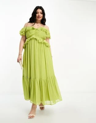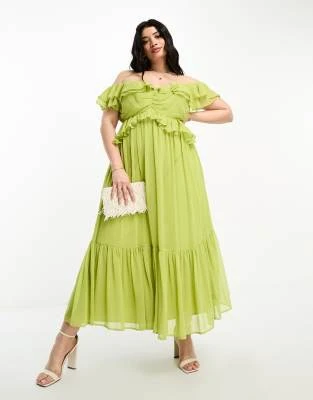 ASOS DESIGN Curve – Vestito Lungo Con Scollo Alla Bardot Plissettato Color Salvia – LGREEN
