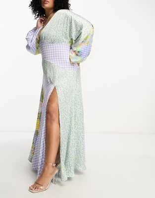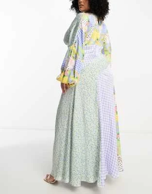 ASOS LUXE Curve – Vestito Midi Decorato Bianco E Blu A Fiori Con Maniche A Sbuffo