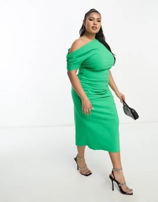 River Island Plus – Vestito Midi Beige Con Volant E Scollo Bardot