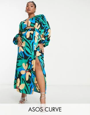 ASOS EDITION Curve – Vestito Lungo Con Scollo Squadrato In Raso Blu Crepuscolare