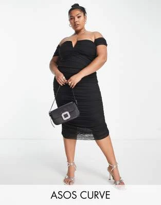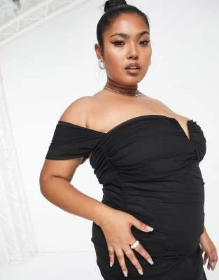 River Island Plus – Vestito Midi Beige Con Volant E Scollo Bardot