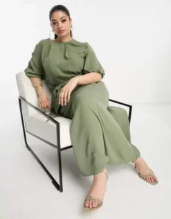 River Island Plus – Vestito Midi Beige Con Volant E Scollo Bardot