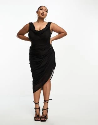 ASOS DESIGN Curve – Vestito Skater Midi Morbido Ricamato Con Godet E Maniche Svasate Nero