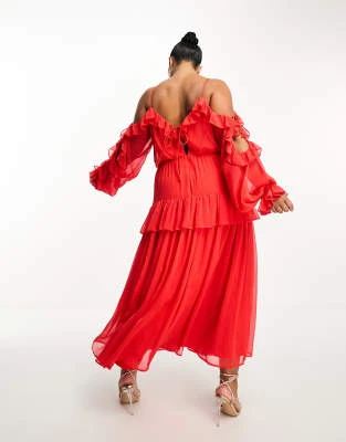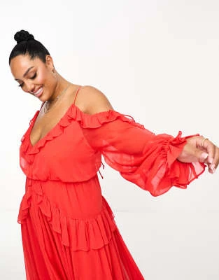 Flounce London Plus – Vestito Lungo Con Maniche Con Volant E Scollo Profondo In Raso Rosa Vivace