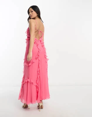 ASOS DESIGN Petite – Vestito Lungo In Rete Rosa Con Stampa A Macchie Con Spalline Sottili E Fascia