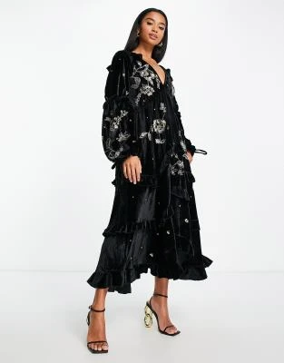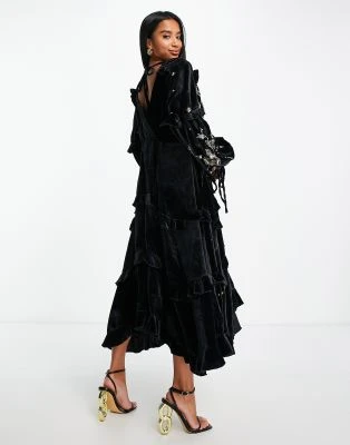 ASOS DESIGN Petite – Vestito Lungo A Pieghe E Balze Verde Salvia Con Scollo Profondo
