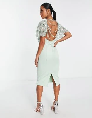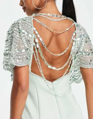 ASOS DESIGN Petite – Vestito Lungo A Pieghe E Balze Verde Salvia Con Scollo Profondo