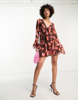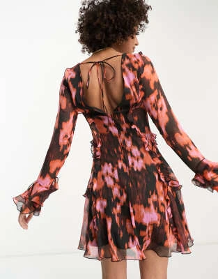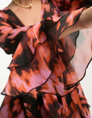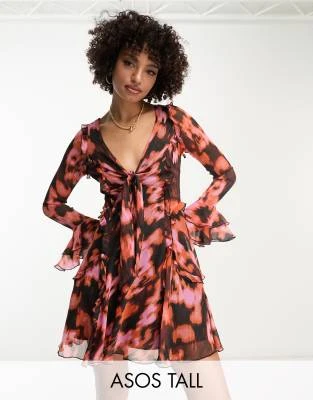 ASOS DESIGN Tall – Vestito In Raso Lime A Fiori Con Gonna Al Polpaccio E Maniche Con Volant Multipli