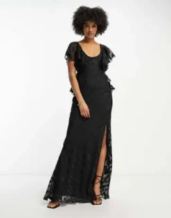 ASOS DESIGN Tall – Vestito Lungo Con Maniche Con Volant E Aperto Dietro In Raso Nero A Pois