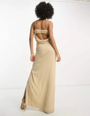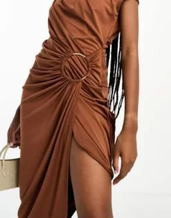ASOS DESIGN Tall – Vestito Midi Cioccolato Con Spalle Scese Drappeggiate E Dettaglio Ad Anello