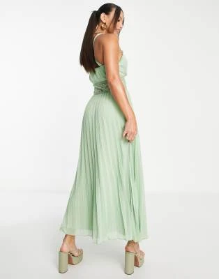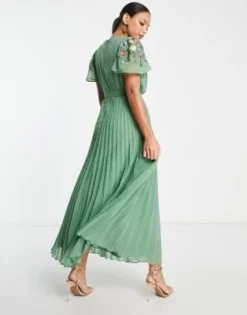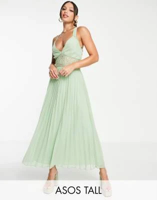 ASOS DESIGN Tall – Vestito Midi In Plumetis A Pieghe Ricamato Color Kaki Con Scollo Ad Anello