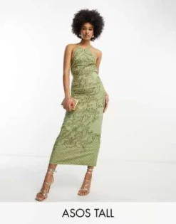 ASOS DESIGN Tall – Vestito Midi In Plumetis A Pieghe Ricamato Color Kaki Con Scollo Ad Anello