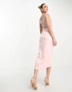ASOS DESIGN Tall – Vestito Midi Con Spalle Scoperte E Perline Decorative Rosa A Portafoglio