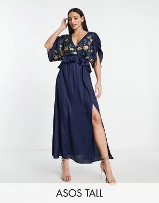 Esclusiva In The Style Tall – Vestito Lungo In Raso Blu Con Scollo Ad Anello E Lacci Sul Retro