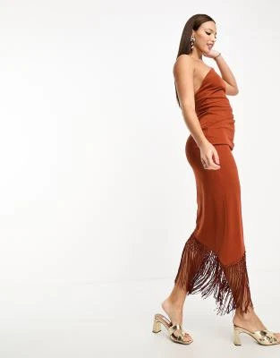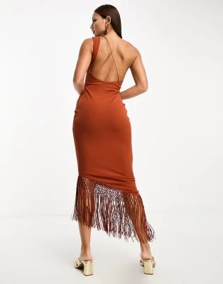 ASOS DESIGN Tall – Vestito Midi Cioccolato Con Spalle Scese Drappeggiate E Dettaglio Ad Anello