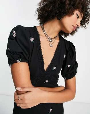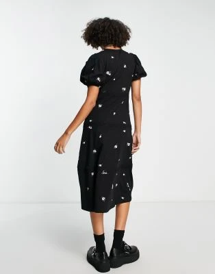 ASOS DESIGN – Vestito Milkmaid Midi Nero E Rosso A Fiori Con Dettagli Arricciati E Maniche Svasate