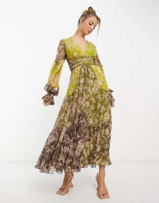 ASOS DESIGN – Vestito Milkmaid Midi Nero E Rosso A Fiori Con Dettagli Arricciati E Maniche Svasate