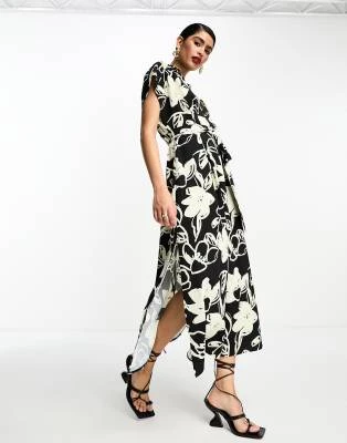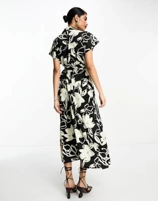 ASOS DESIGN – Vestito Milkmaid Midi Nero E Rosso A Fiori Con Dettagli Arricciati E Maniche Svasate