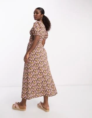 ASOS DESIGN – Vestito Midi Da Giorno Arricciato In Vita Con Maniche Voluminose Con Stampa A Fiorellini Rosa Polvere