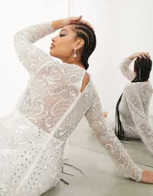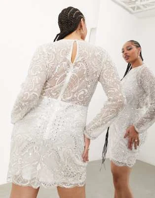 ASOS LUXE Curve – Vestito Midi Decorato Bianco E Blu A Fiori Con Maniche A Sbuffo