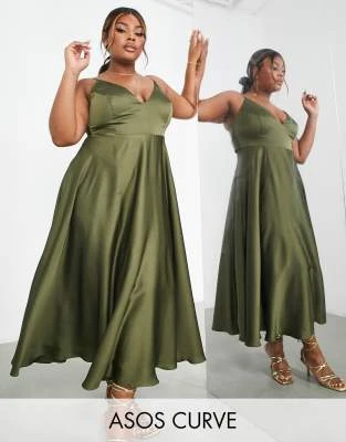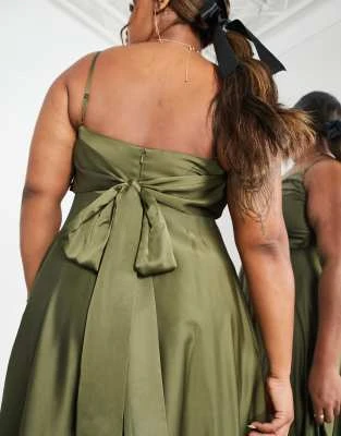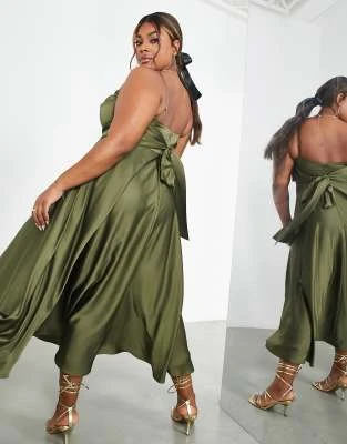 Flounce London Plus – Vestito Lungo Con Spalline Sottili E Volant In Raso Kaki