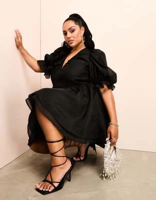 ASOS DESIGN Curve – Vestito Skater Midi Morbido Ricamato Con Godet E Maniche Svasate Nero