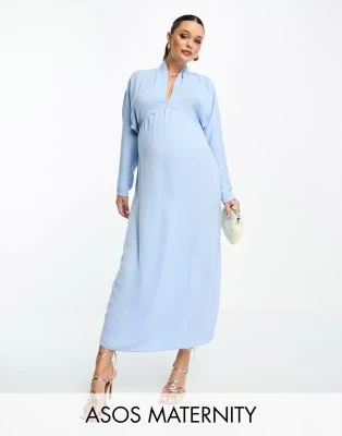 ASOS Maternity ASOS DESIGN Maternity – Vestito Midi Blu Pallido Con Scollo Profondo E Maniche Ad Ali Di Pipistrello