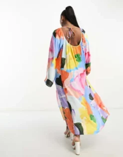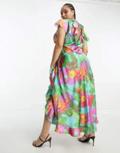 ASOS DESIGN Curve – Vestito Avvolgente Lungo In Raso Con Stampa A Fiori Grandi Vivaci E Volant