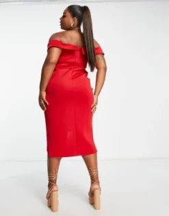 ASOS DESIGN Curve – Vestito Midi Rosso Con Spalle Scoperte E Volant