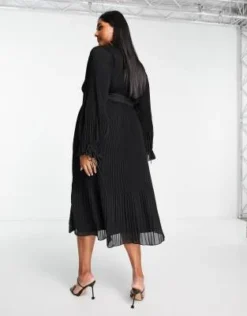 ASOS DESIGN Curve – Vestito Midi Nero A Pieghe Con Maniche A Campana E Cintura