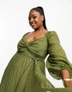 ASOS DESIGN Curve – Vestito Midi Testurizzato Raccolto Asimmetrico Color Verde Pistacchio